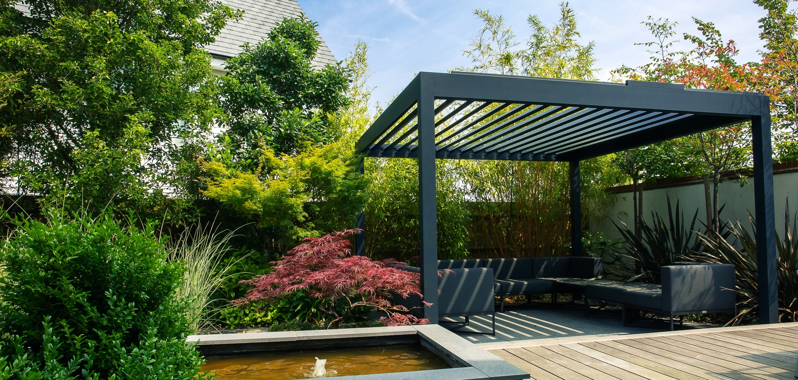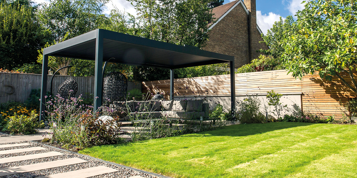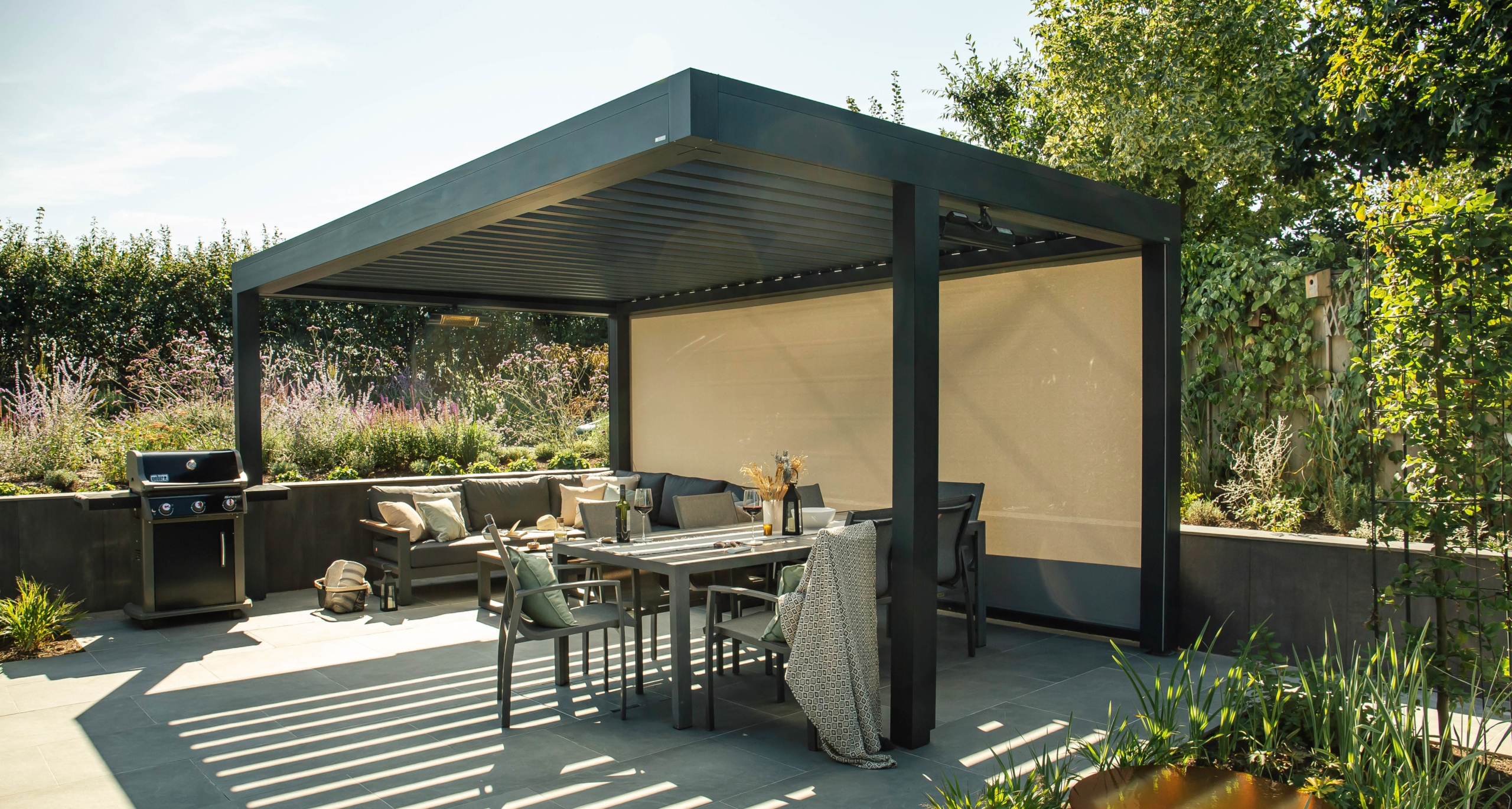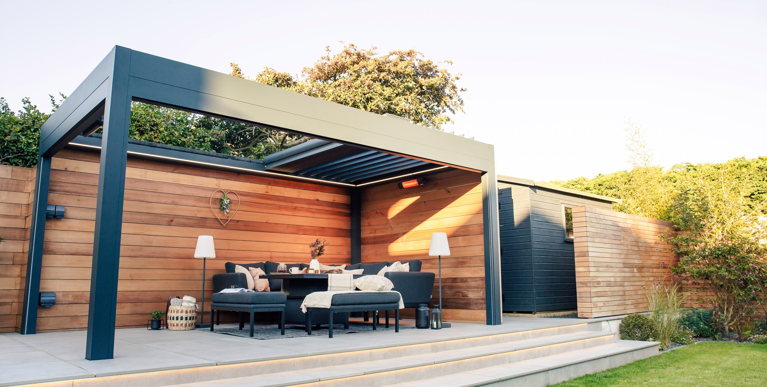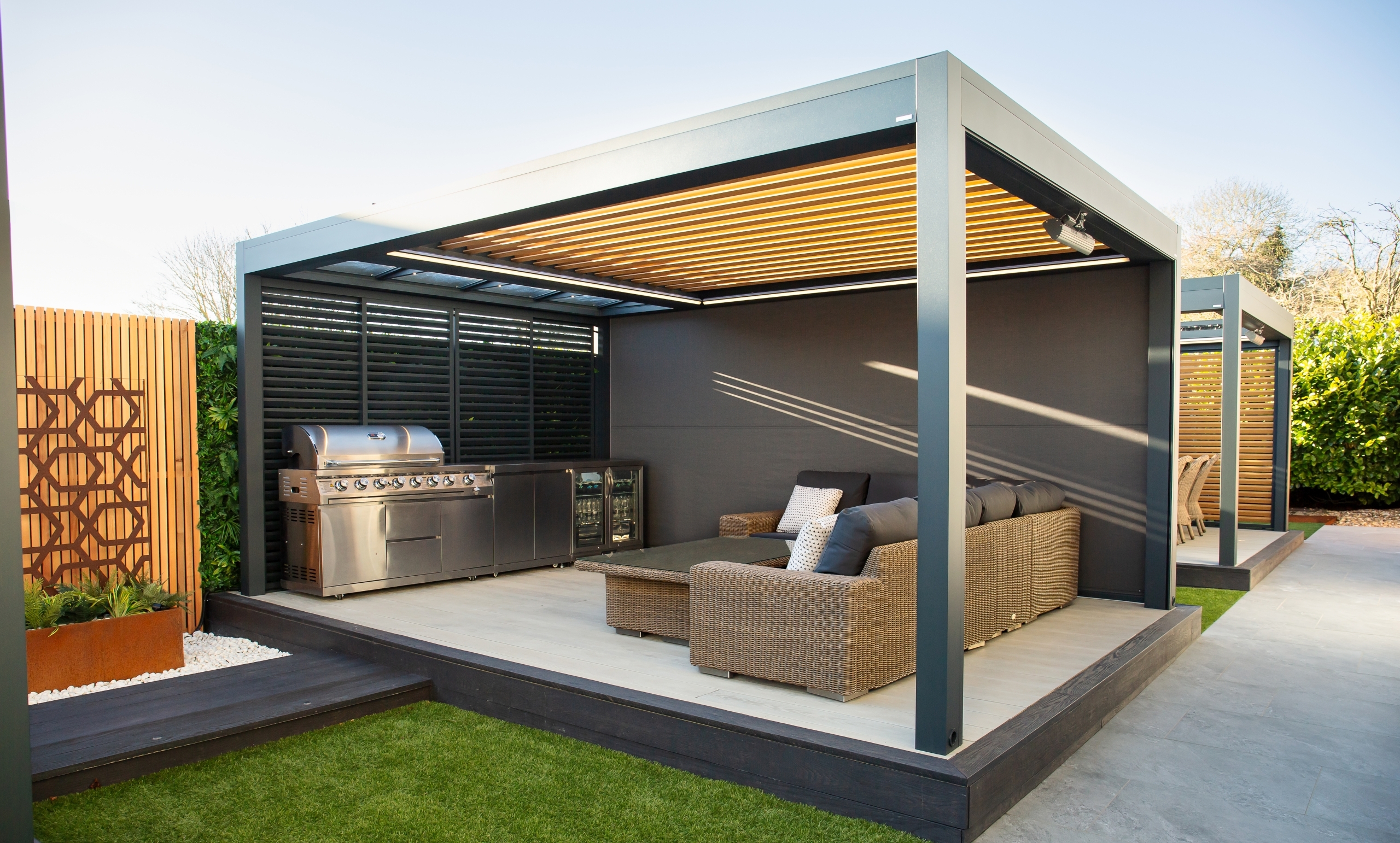 A new era in pergola design, the Deluxe + Pod provides a multifunctional terrace covering which combines a fixed roof with rotating louvers. Available from £21,995, this pergola is ideal for outdoor kitchens and seating or dining areas.