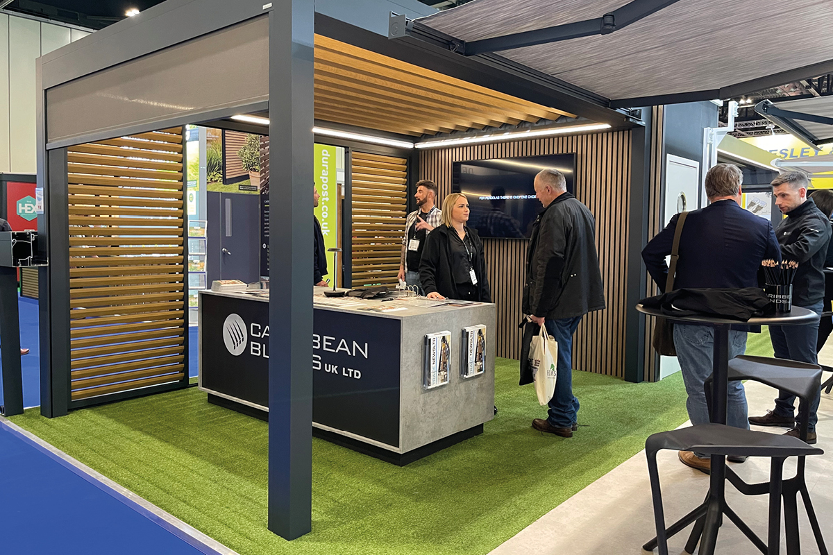 A trade show booth with "CARIBBEAN BLINDS UK LTD" branding features people engaging in conversation. It has a modern design with wooden slats and artificial grass flooring. Nearby, brochures are displayed.
