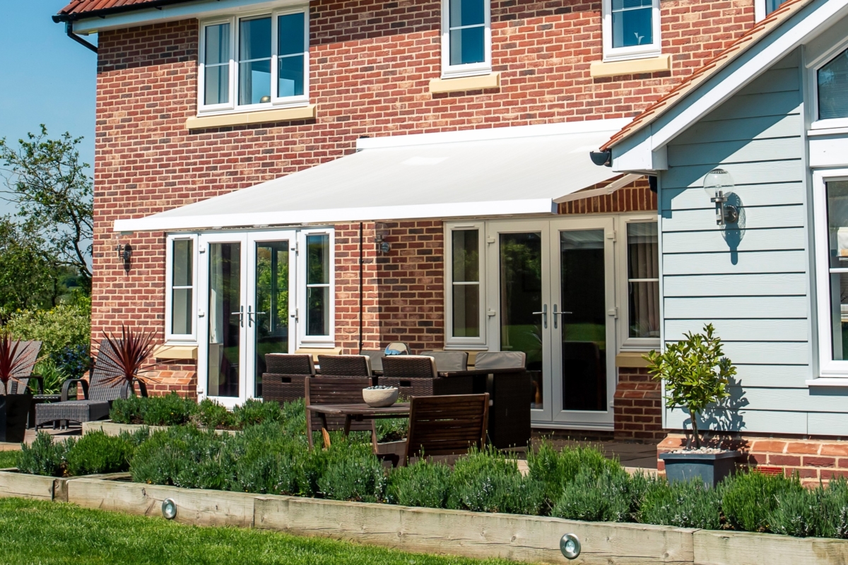All of our patio awnings exclusively feature Clean Brilliant Acrylic (also known as CBA) fibres which is the finest in solar shading fabrics available today. This technology offers unbeatable heat, light and UV ray resistance, meaning that not only is the fabric robust enough to withstand stretching but also acts as a protection against fading. That is why you can rest assured that any of our designs will stay looking fresh and vibrant for their lifetimes. This material is also water repellent, ideal for keeping you protected during rainfall, and offering a self-cleaning effect to the awning, meaning it will stay clean and bright looking for longer. It is because of these properties that we can assure our clients that investing in an awning can be stress free and very low maintenance.