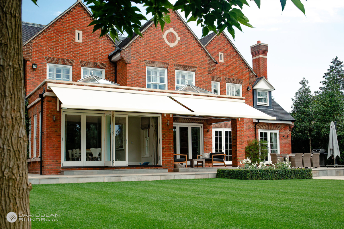 Our experienced surveyor worked closely with the clients to understand their needs to then come up with a viable shading solution that would fulfil the purpose of shading their outdoor dining area and minimising the rising internal room temperatures – see our solar shading guide for more information. With the garden catching a lot of the sun our team constructed a bespoke retractable awning measuring 3.8m wide and a maximum projection of 3.75m. This will cover a substantial amount of their patio terrace to provide a sufficient amount of shading over their alfresco dinning set whilst keeping the glazed patio doors cool to reduce the impact of solar heat gain.