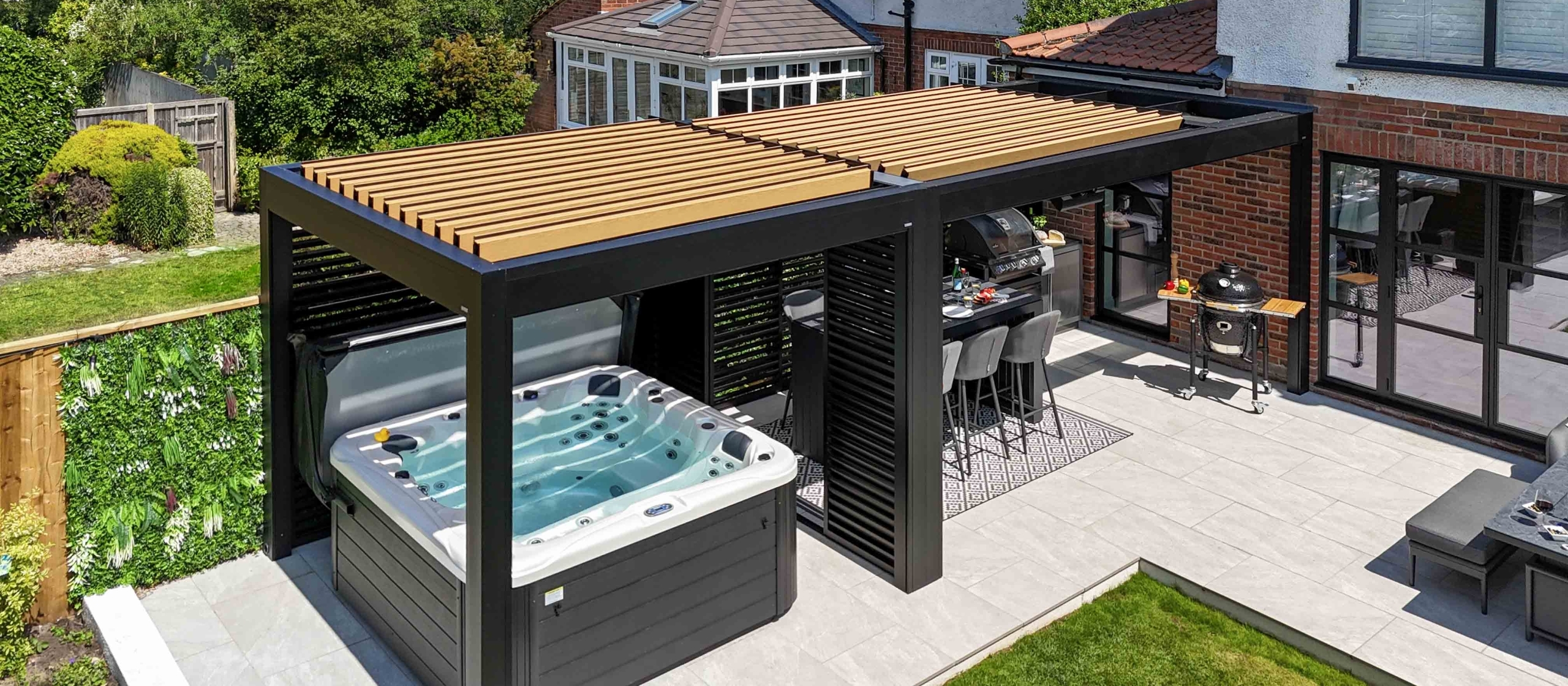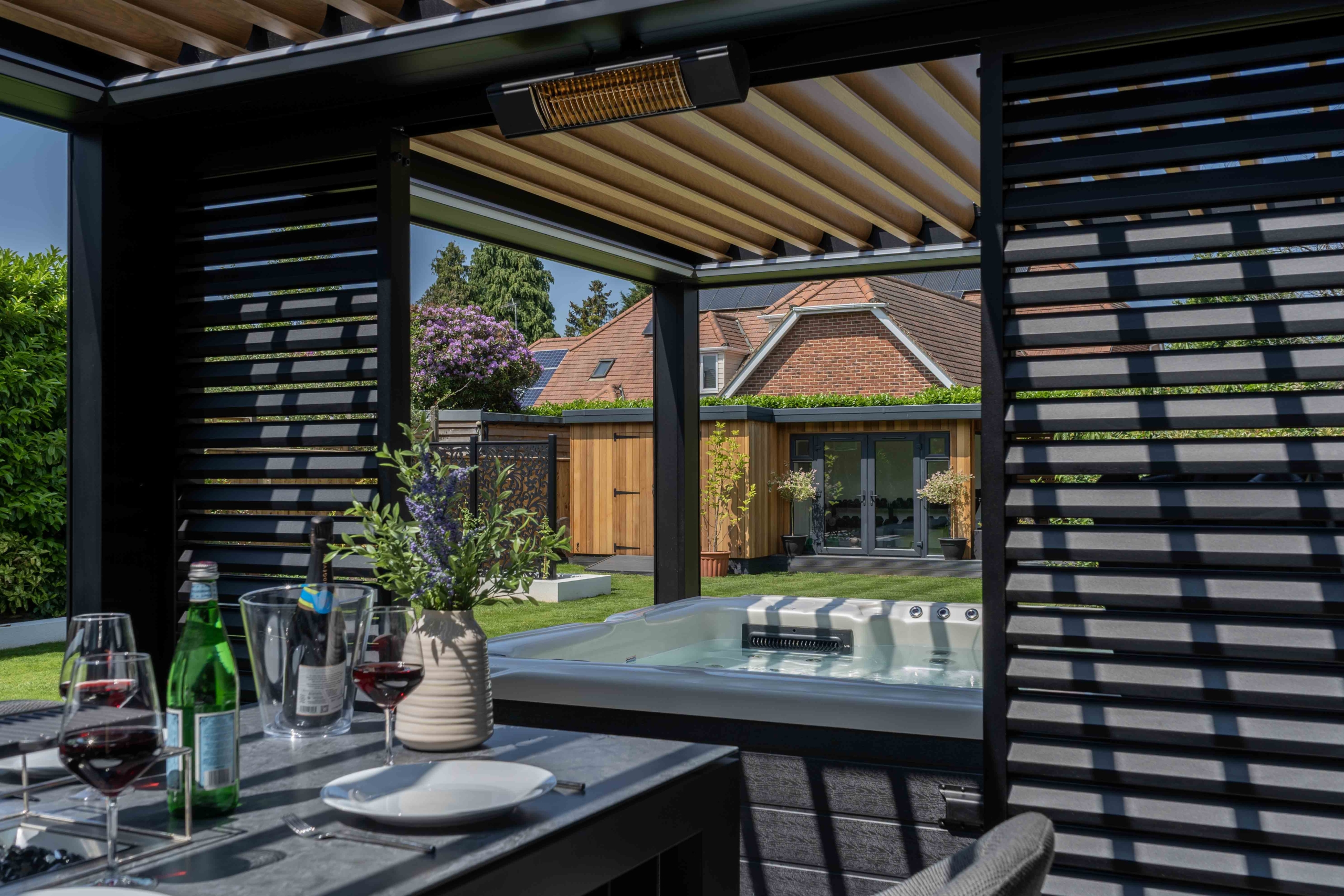 The structures were carefully finished to complement the home’s architecture. A black powder-coated framework to match the crittal-style doors complimented with natural oak wood-effect aluminium louvres to introduce warmth and contrast. The result is a bespoke architectural feature that feels fully integrated rather than added on.