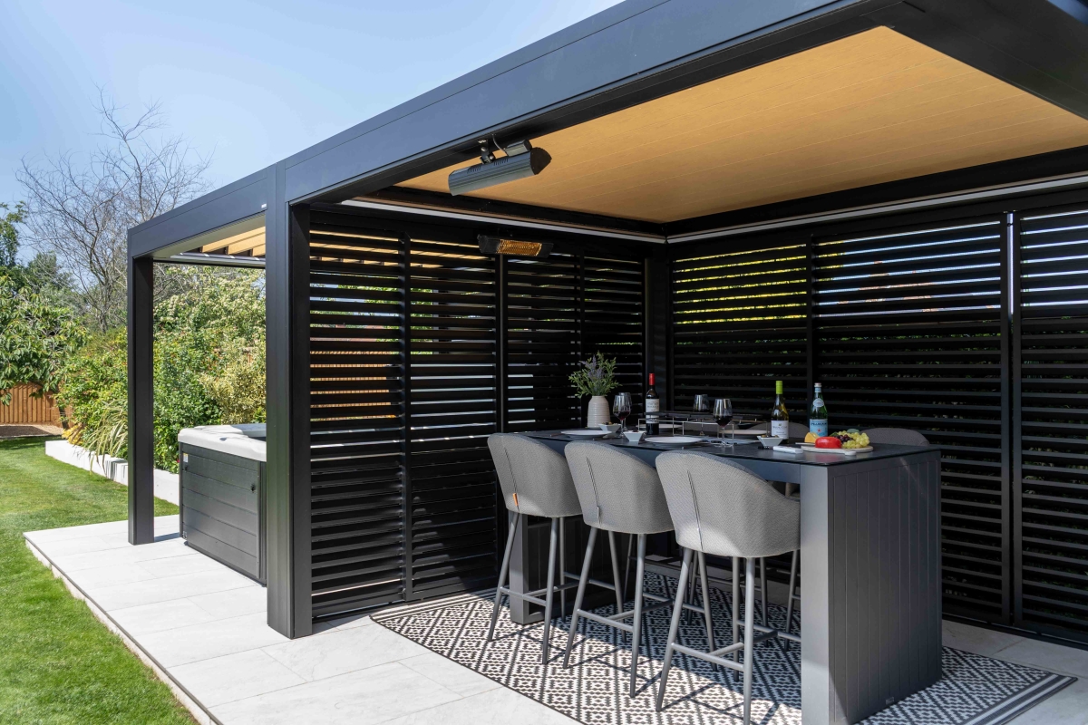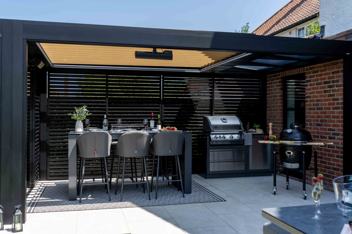 A key consideration of the design was preserving natural light into the adjoining utility room. The Deluxe+ Pod, installed directly against the property, incorporates a 1.5m fixed glass roof section before transitioning into rotating louvres. This ensures zero light loss internally, while still delivering full weather protection externally.