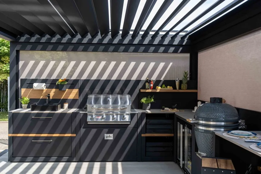 The Grillo Pergola, available in four sizes, is designed to complement Grillo outdoor kitchens and dining spaces. With motorised louvered roof and optional lighting and heating, it creates a versatile and functional outdoor living area that can be enjoyed throughout the seasons.
