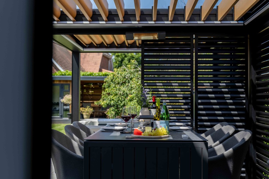 At the top of the range, the Prestige Outdoor Living Pod combines a rotating and fully retractable louvered roof, offering the greatest flexibility. It allows full shelter during rain or wind and can open completely for sunshine. Optional side screens, lighting and heating transform the pergola into a comfortable outdoor room, providing an all-weather solution for early-spring use.