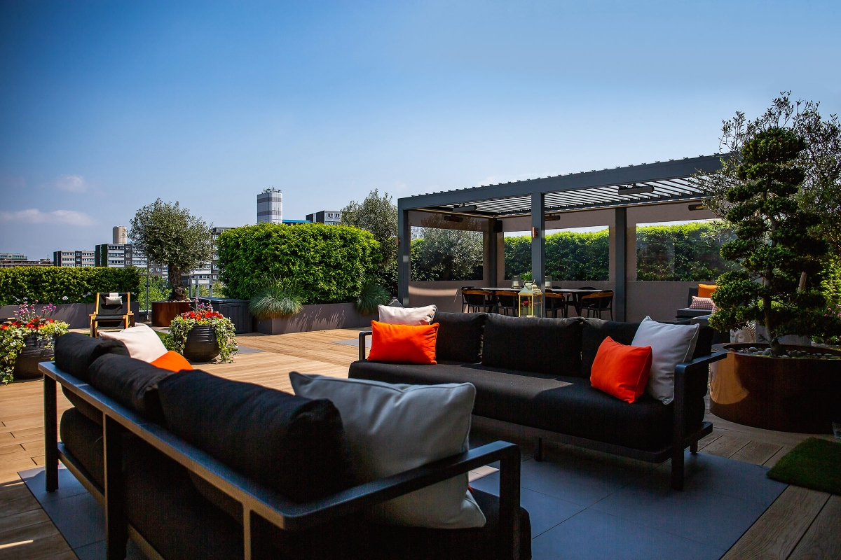 Our team of designers worked closely with the client to create a unique custom-made aluminium pergola to harmonise with the rest of the terrace garden design features. The aluminium louvered structure was powder coated to a Mouse Grey Smooth Matt (RAL 7005) which created a gorgeous effect that contrasted perfectly with the bespoke gold light fixtures which were mounted on the upright posts. To set the scene we integrated ambient internal perimeter lighting and fixed outdoor speakers in two corners of the louvered pergola. With the penthouse garden being quite high up you can imagine that there is a lot of wind to tackle so we incorporated windproof side screens with clearview windows so it was not to spoil the view on all sides and to help enclose the sheltered space away from the elements.