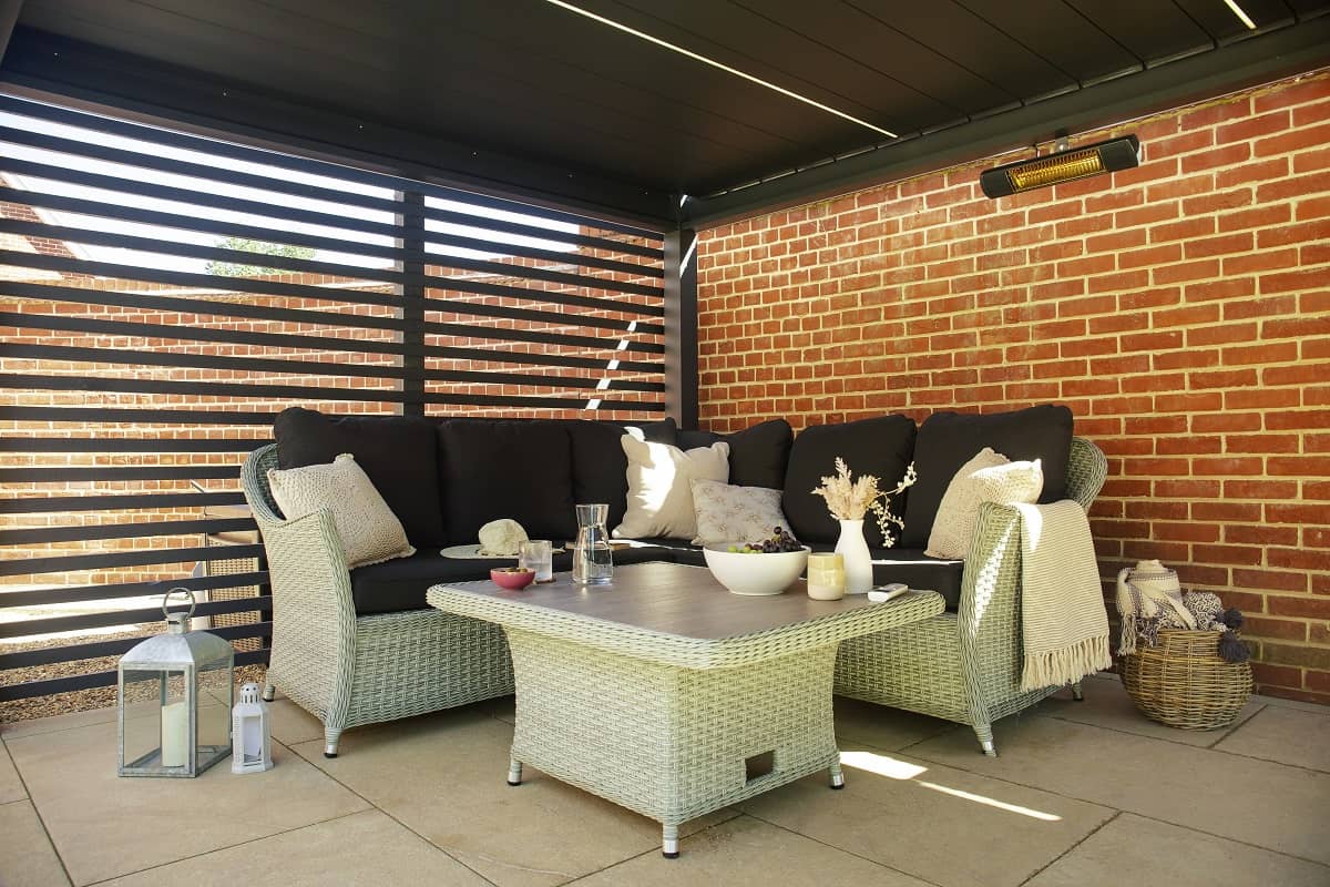 If you’re looking for a more modern pergola with a minimalist finish, embrace clean lines and sleek aesthetics by combining an anthracite grey aluminium pergola with modern outdoor furniture and decorations.