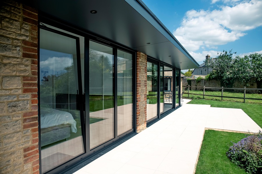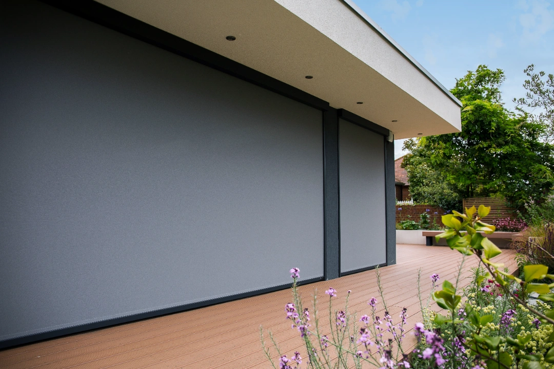 Made to measure external roller blinds sit neatly against patio doors and large windows. The fabric wraps around a roller tube sized to match the width and drop so the blind runs true without sagging. A lead rail with an integral weight keeps the fabric taut at every position. Side guides ensure a smooth square run and, with a zip locking mechanism, the fabric is held within the guides so there is no gap. This locking system improves wind resistance, prevents light seepage and, when paired with mesh, works as an insect screen while maintaining the view from inside.