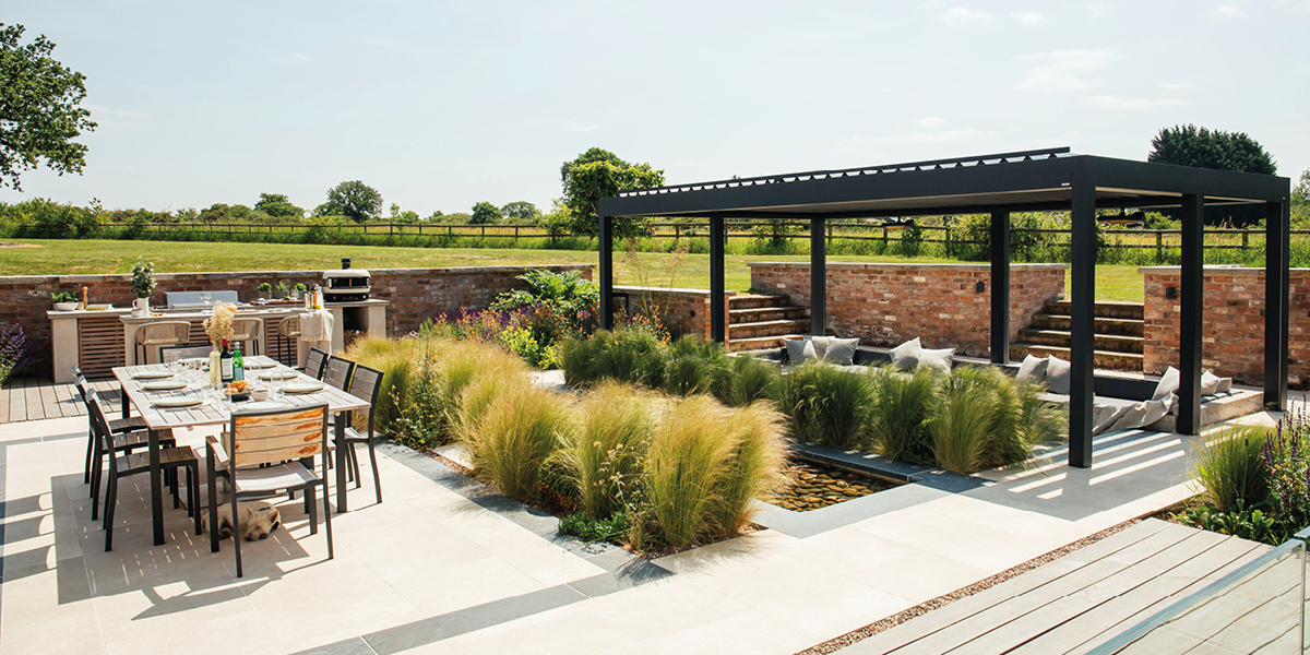 A patio features a dining table set for a meal, beside a pergola-covered seating area with cushions, overlooking a garden with ornamental grasses and brick walls in a rural landscape.