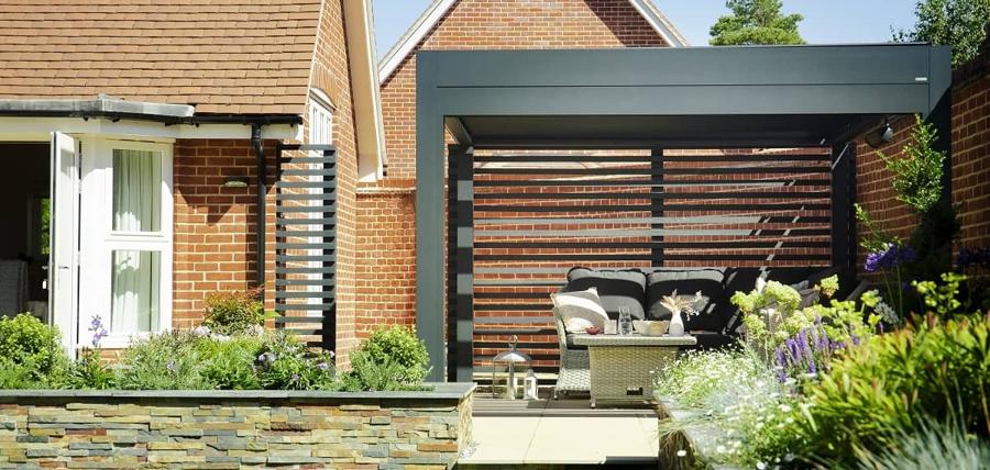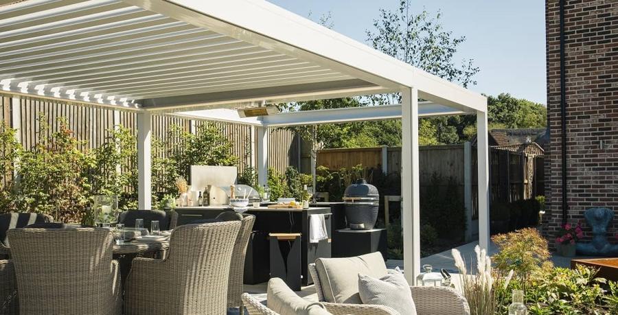 A new era in pergola design, the Deluxe + Pod provides a multifunctional terrace covering which combines a fixed roof with rotating louvers. Available from £21,995, this pergola is ideal for outdoor kitchens and seating or dining areas.