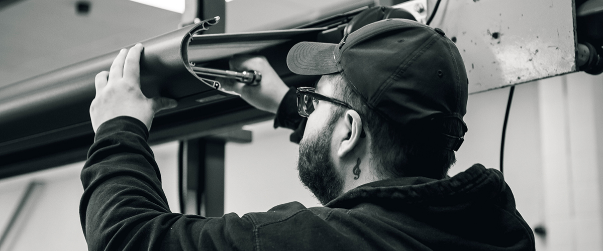 A person wearing a cap and glasses adjusts a metal component using tools in an industrial setting, surrounded by machinery and blurred background elements.
