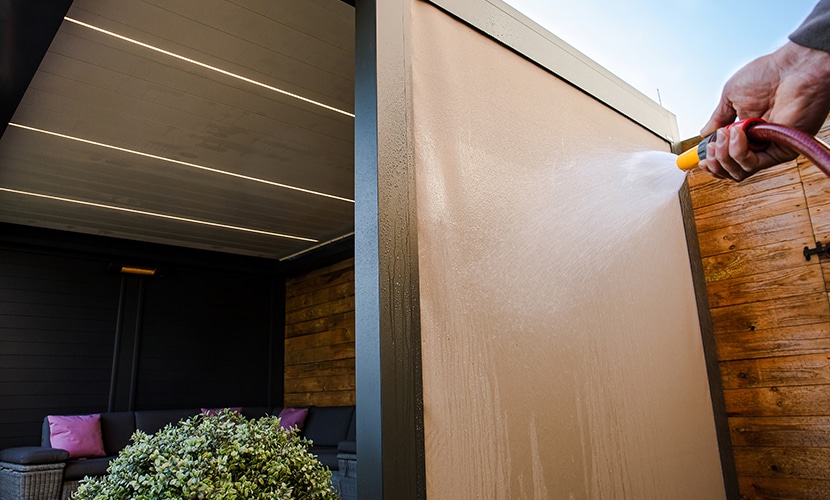 Substances, such as birds mess and tree sap which ‘stick’ to the fabric should be hosed off immediately to avoid any damage to the protective coating and for dried-on sticky debris a sponge and mild soapy (circa 2% acidic) water solution should be used to clean it off, which then should be rinsed with clean water to ensure that no soapy remnants stay behind on the material and the material allowed to dry off before retracting the louvered roof pergola side screen away.