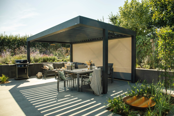 Featuring the same robust 21cm wide roof louvers as our Deluxe Pod, which rotate through 150 degrees, you can enjoy optimum levels of light or shade beneath and when fully closed, the interlocking louvers form an entirely watertight covering. Integrated optional side screens provide additional protection from the elements; both breezes and rain whilst also offering low level sun protection and privacy from prying eyes whilst LED lighting, integrated in the cross beam and / or roof louvers coupled with infra-red heating ensure a cosy environment year round.