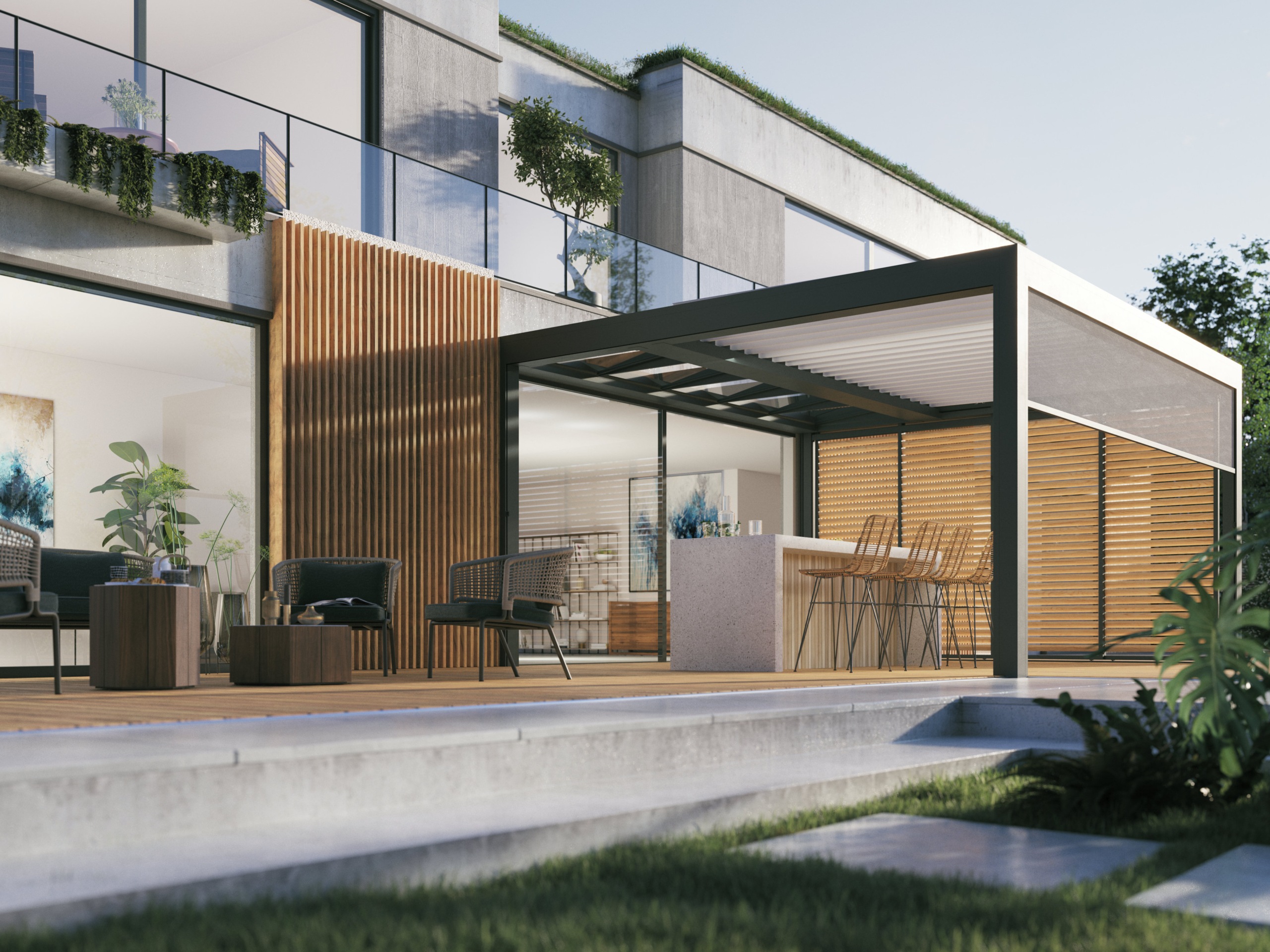 The Deluxe + Pod, is a new era in pergola design, providing a multifunctional terrace covering, combining both a fixed roof of either glass or solid panels and rotating louvers, ideal for installing above an outdoor kitchen and seating/dining area or adjacent to a property to maximise light to the indoor space.