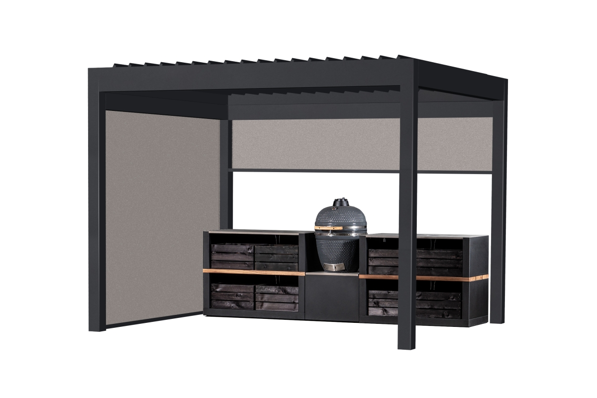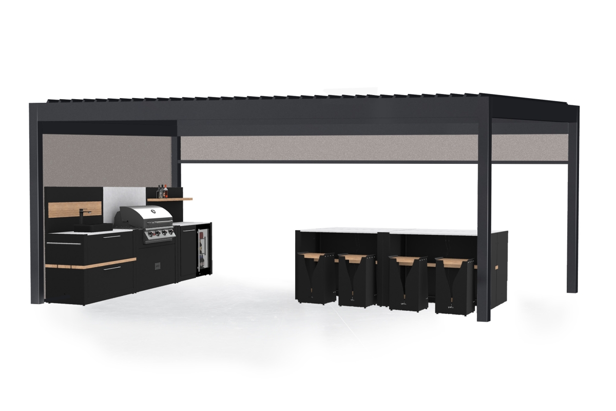 Enabling you to cook up a storm 365 days a year, the motorised roof louvers, which rotate effortlessly through 150 degrees, allow you to enjoy full sun, dappled light, cooling shade or complete shelter from rain, wind or even snow. Sun screens can be incorporated into the sides for additional shade from low sunlight and protection from breezes and rain showers, whilst the ambience package consisting of LED lighting integrated within the roof louvers and an instant infra-red heater ensures a cosy and pleasant environment beneath the pergola all year round.