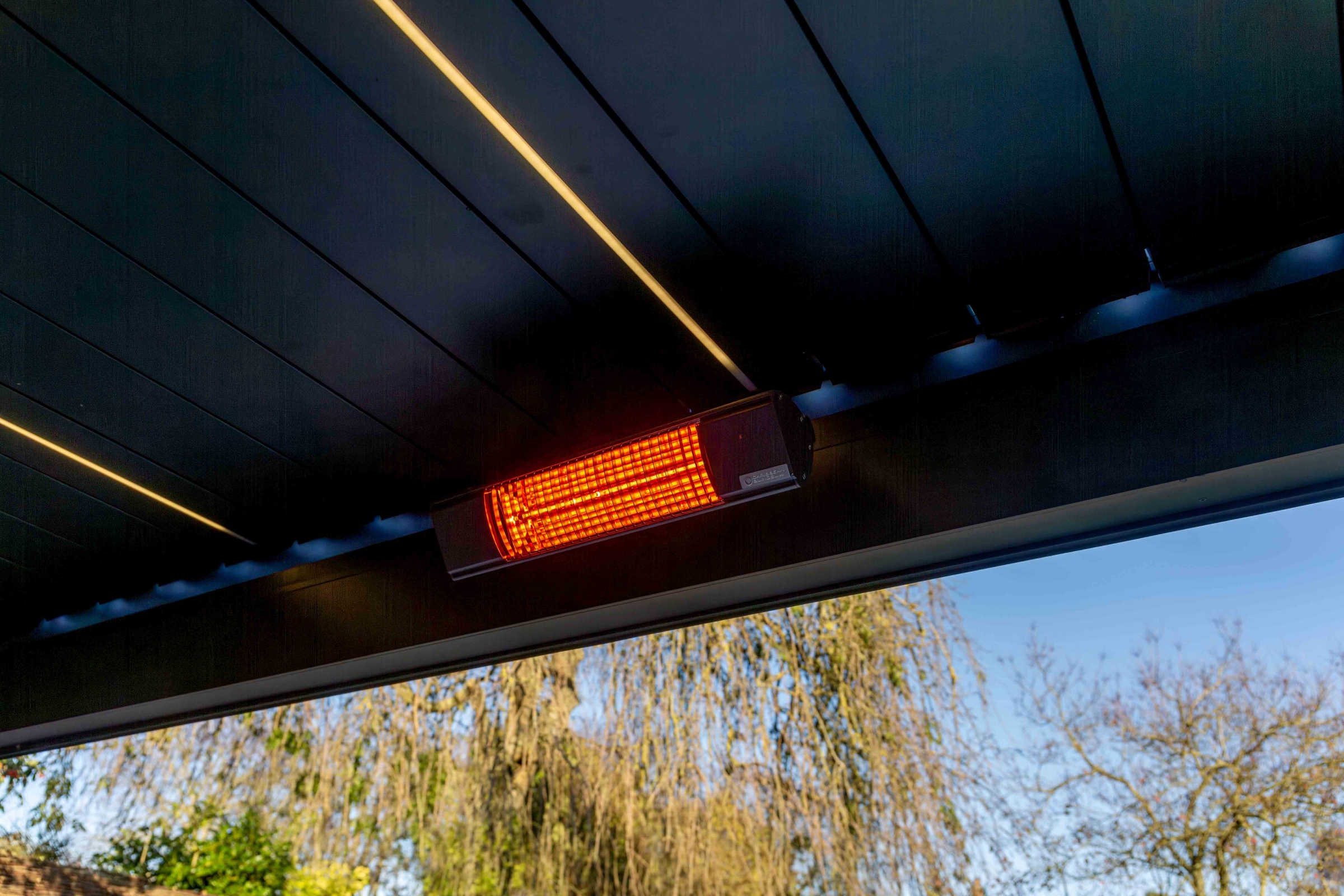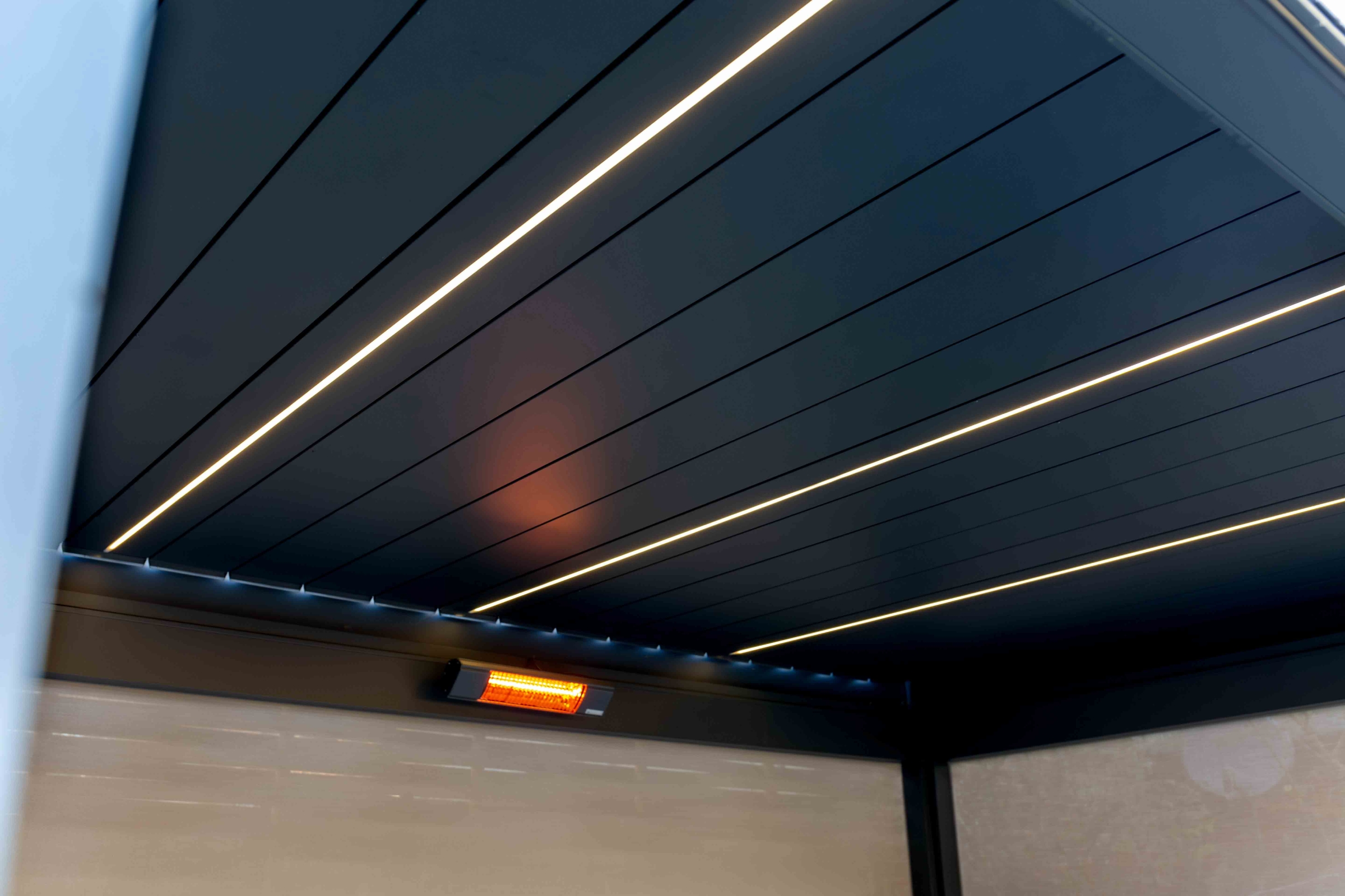 Optional warm white dimmable LED light strips integrated in the roof louvers along with an infra-red heater create a cosy environment.