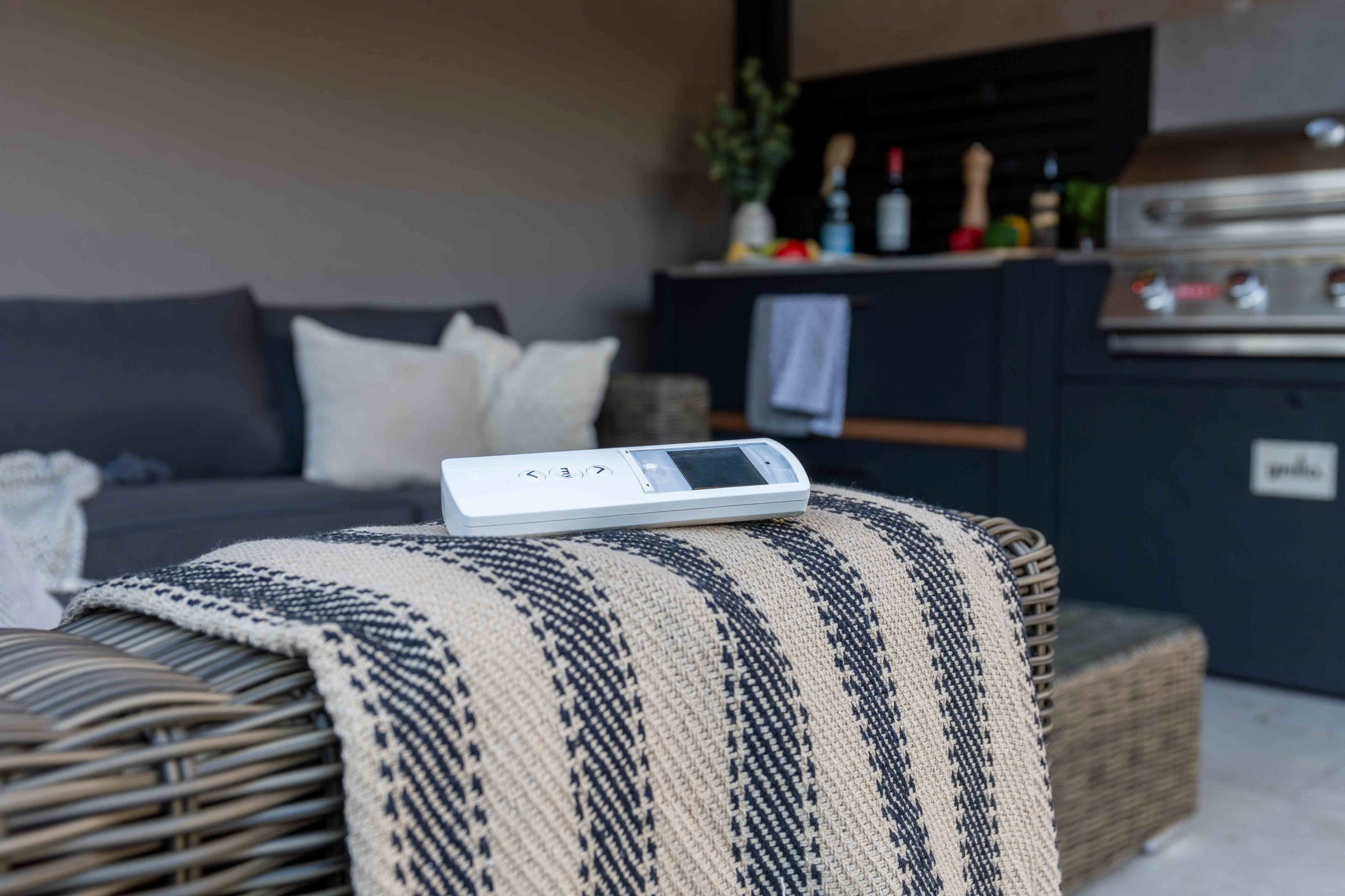 The Grillo pergola, louvered roof and all options (sun screens, lighting & heating) are conveniently and effortlessly operated from a handheld remote control or optional app control.