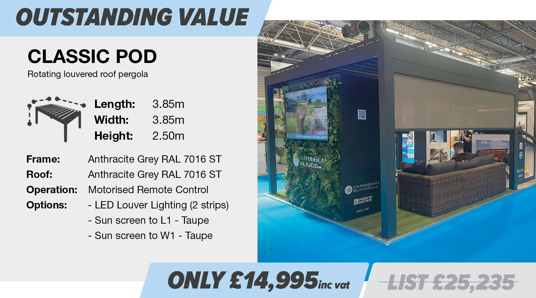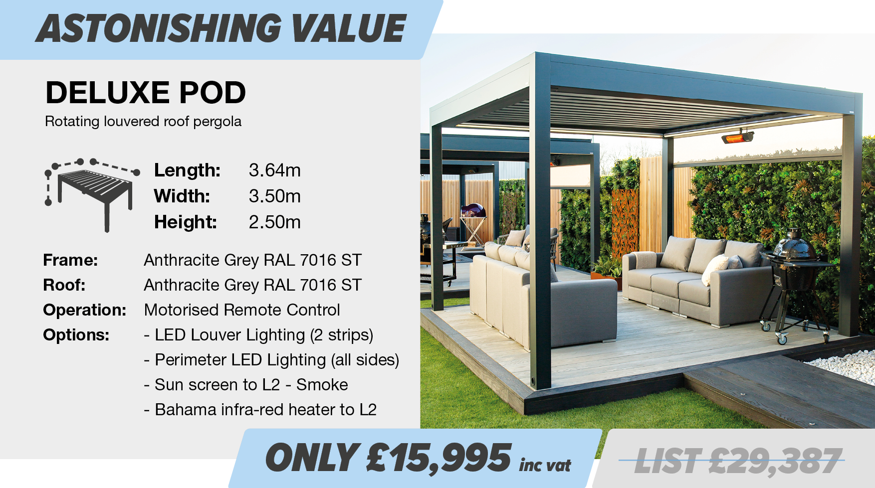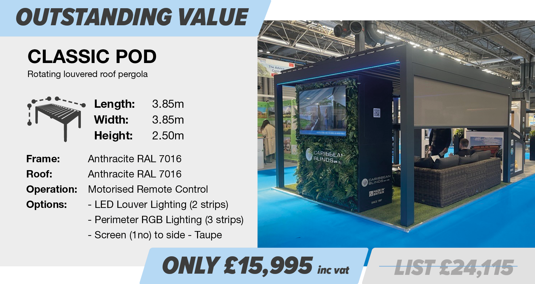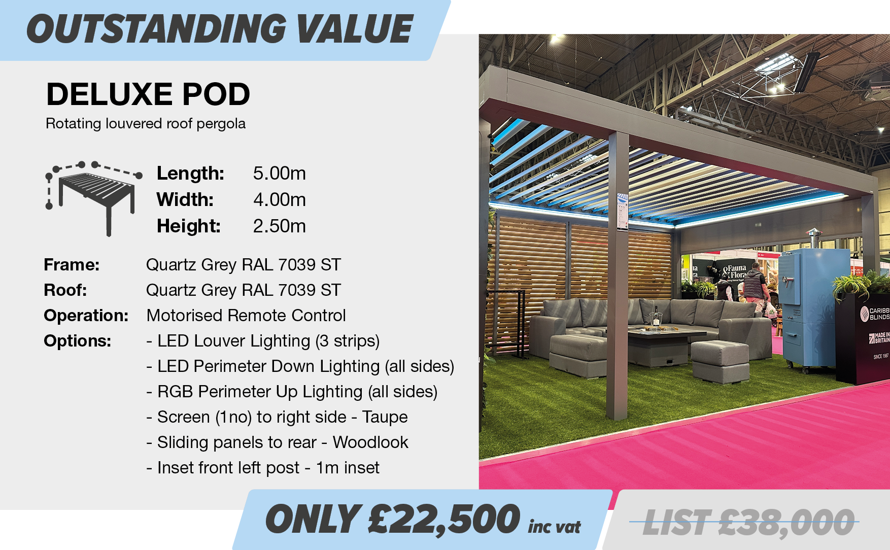 In addition to the above AW25 sale, we are pleased to offer the below ex-demo pergolas, which offer phenomenal value for money, providing savings of more than 35% off list price. Equipped with a range of options as standard, offering an impressive specification, you have the ability to add further options should you wish to completely customise. Hurry though, at these special prices they won’t be around for long.